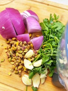 Place pistachios, onion, garlic, parsley, salt, pepper, chili powder, paprika and oregano into a food processor and blend until thoroughly mixed